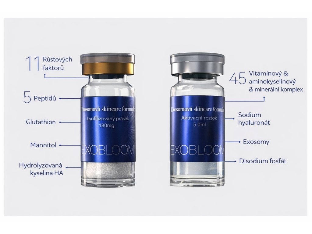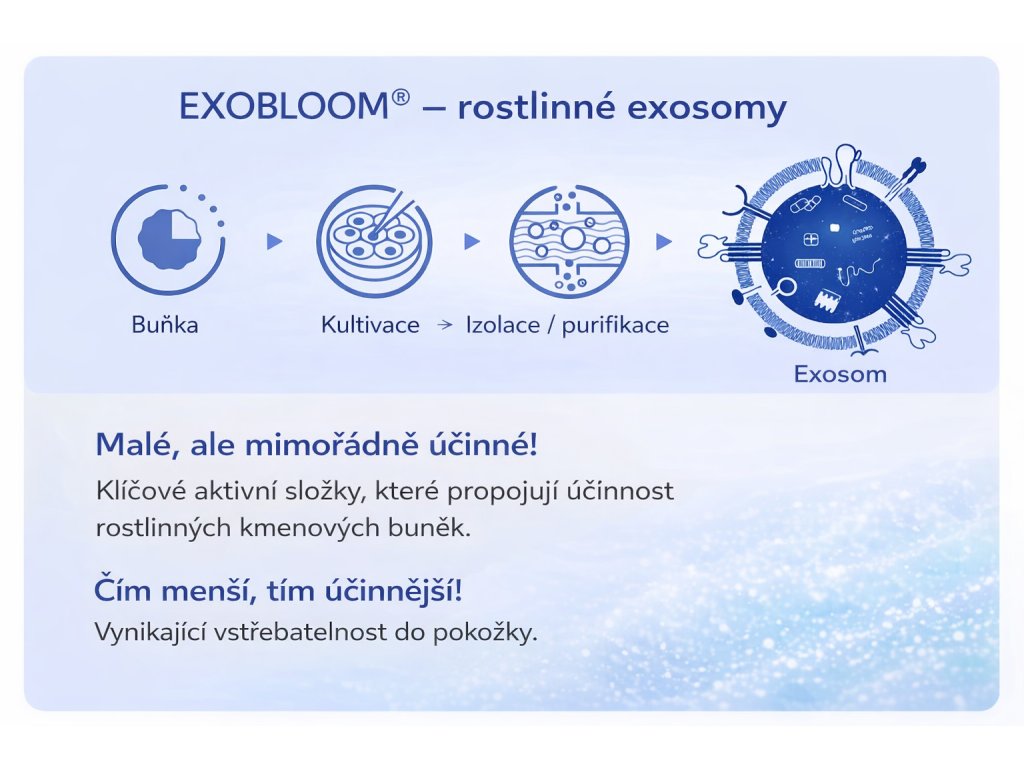 Exobloom® Exosome Skin Booster obsahuje široké spektrum aktivních složek, které se vzájemně doplňují: