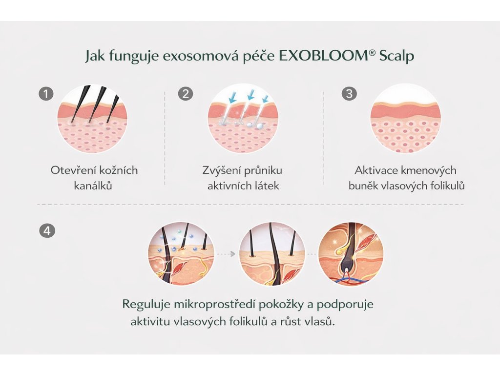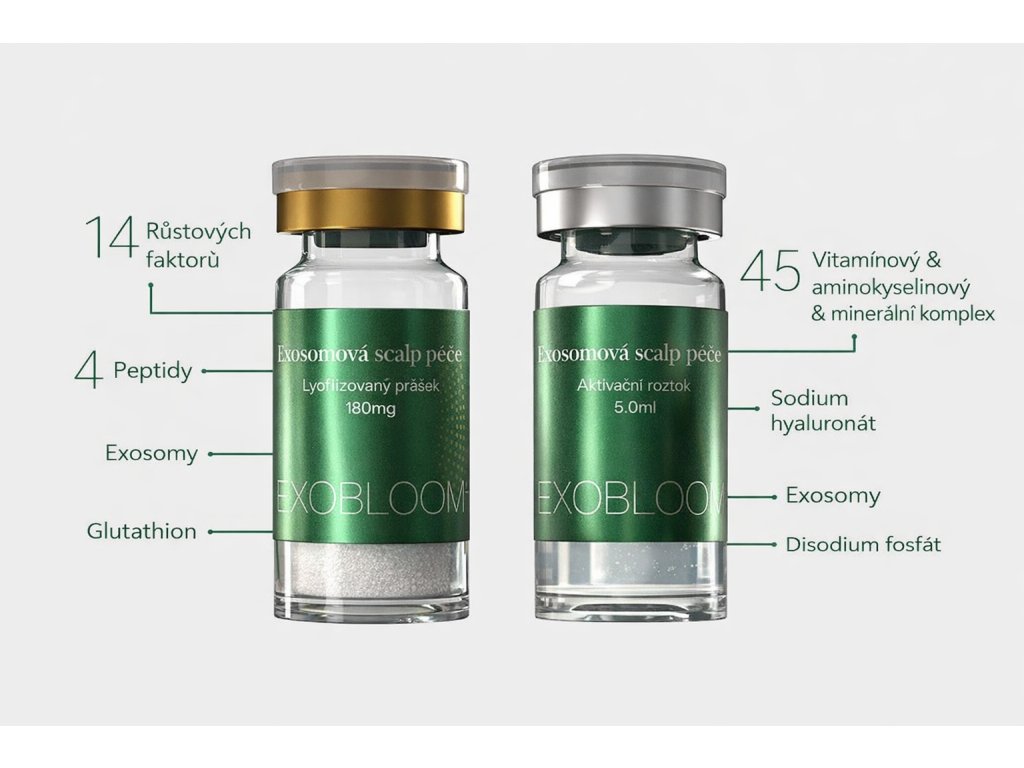 Díky klinicky ověřené receptuře a globálně patentovanému procesu čištění exosomů nabízí EXOBLOOM® Scalp Care špičkové výsledky pro odborníky i klienty, kteří hledají moderní a medicínsky pokročilé řešení vypadávání vlasů.