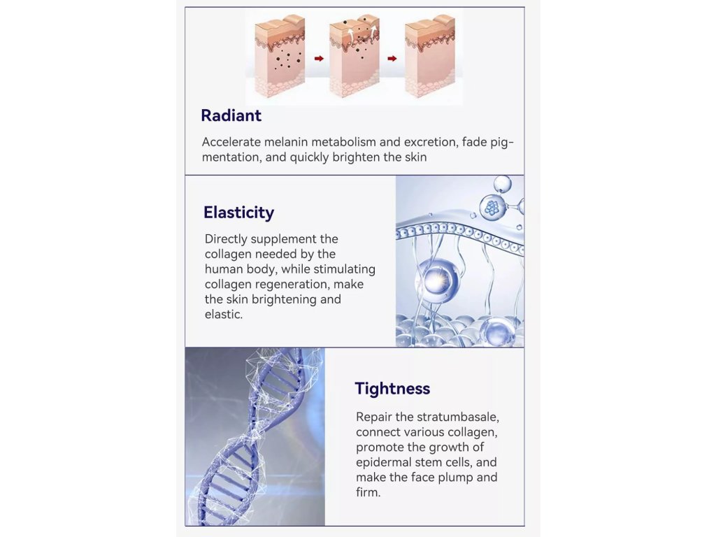 Základ tvoří kolagen typu III, který je přirozeně hojně zastoupen v mladé pleti a přispívá k jejímu hladkému a pružnému vzhledu. Doplněn je o kolagen typu XVII, jenž podporuje soudržnost kožních vrstev a pomáhá udržovat zdravou strukturu pokožky. Společně napomáhají tomu, aby pleť působila pevnější, vyhlazenější a sjednocenější.